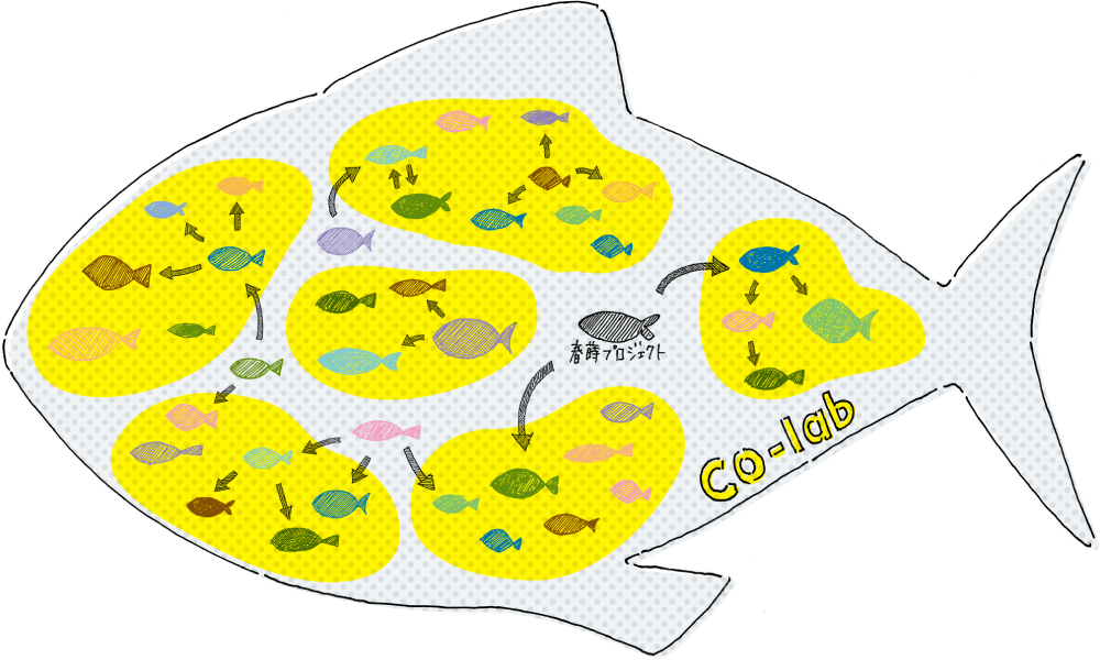 co-lab には多様な個人クリエイターが集積し、そのオリジナリティを有する個々が絵本『スイミー(レオ・レオニ作)』のお話のように必要に応じて集合体になり、協働しながら課題の解決に向かいます。