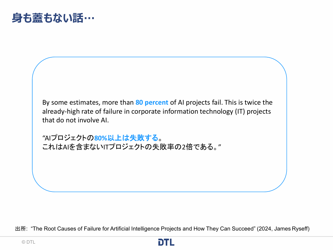 「ある調査では、AIプロジェクトの8割以上は失敗すると言われていますが、私自身の実感としてもその通りだと感じています」と中村さんは語ります。
