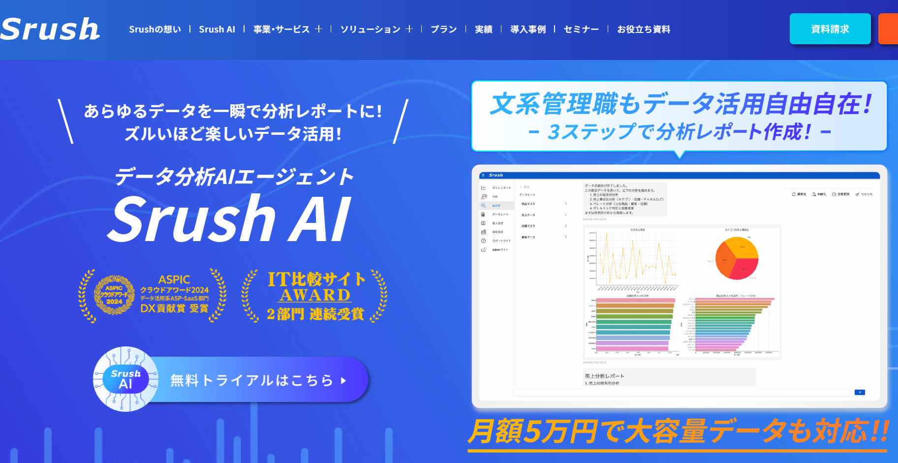 このビジョンを実現する中核となるのが、対話型データ分析AIエージェント「Srush AI」です。これは、専門スキルを持つ人材がいなくとも、社内に散在する大量のデータを瞬時に統合し、自然言語で質問するだけでグラフや表を出力できるノーコードのAIデータ分析ツールです。特に、裏側に大量データ処理に特化したデータ基盤を搭載している点が特徴で、「自社専用のChatGPT」のように機能し、「データ分析に特化したAI」として高い評価を得ています。これにより、データ活用を専門家だけのものにする「ヒエラルキー管理」ではなく、「誰もが使えるAI」というデータ活用の四民平等を実現しています。