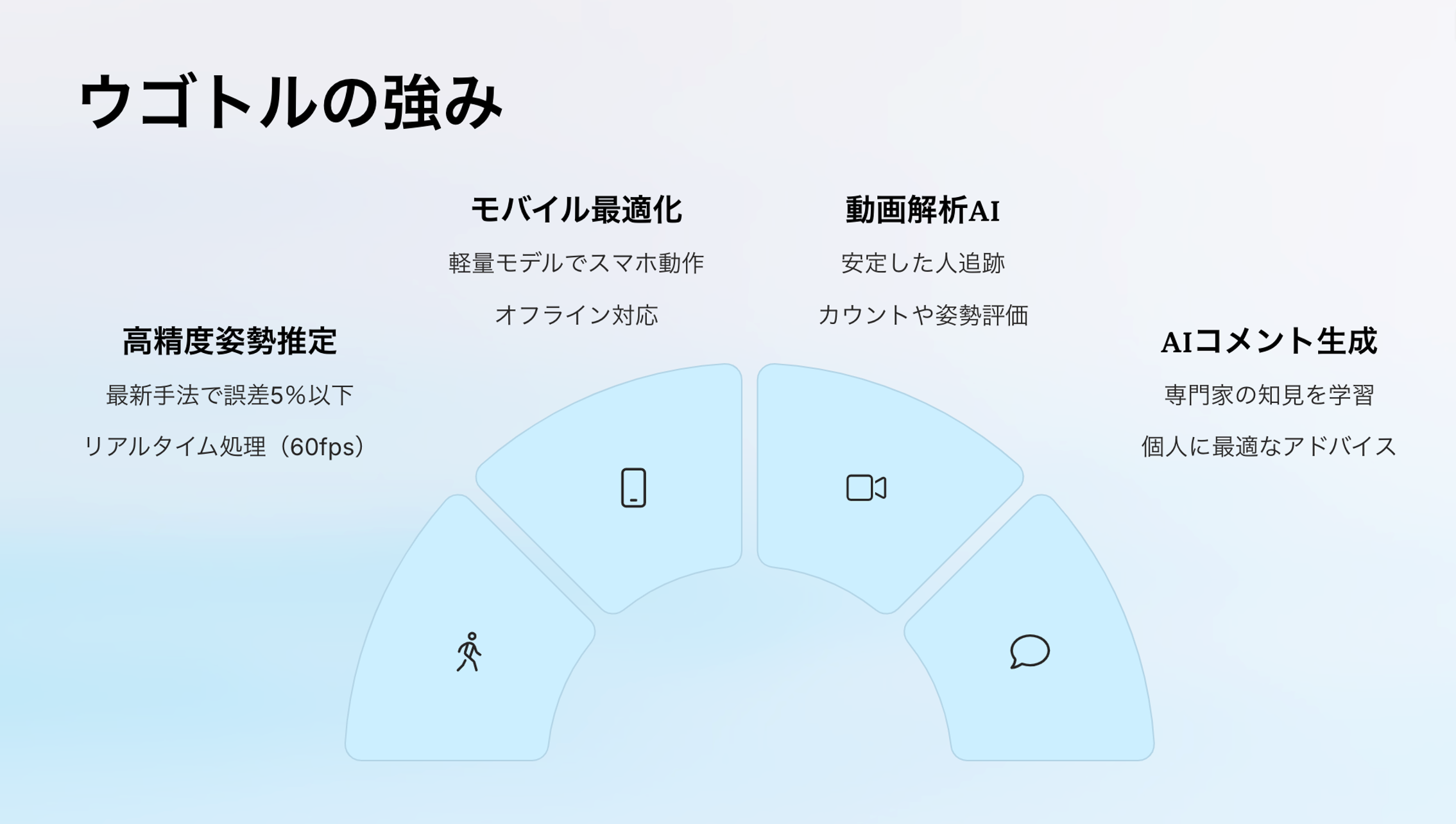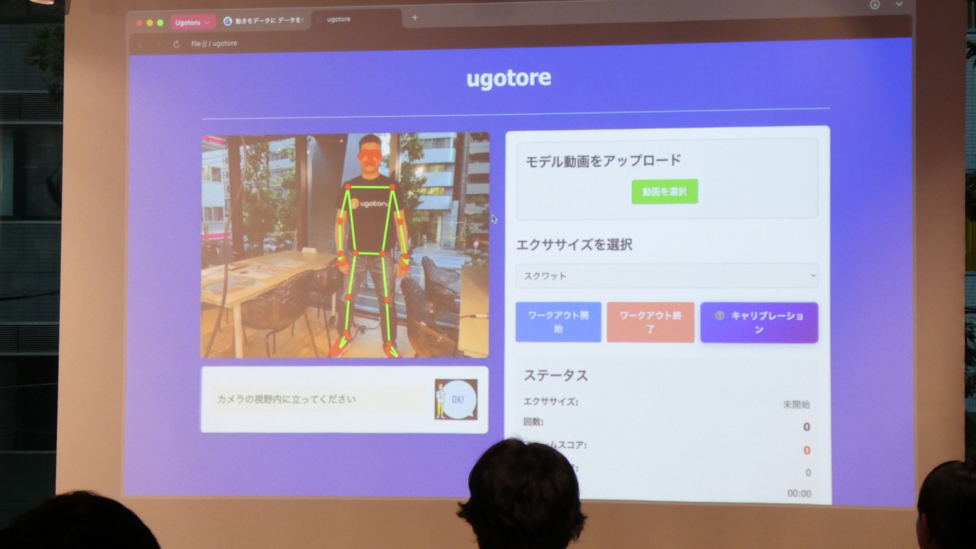 そして、現在開発中の「ウゴトレ」は、自主トレーニングを特に目標なく延々と続けるモヤモヤから脱却するため、トレーニングのたびにAIが自分に合った評価をして体の動きをサポートしてくれるリアルタイムフォーム改善アプリです。