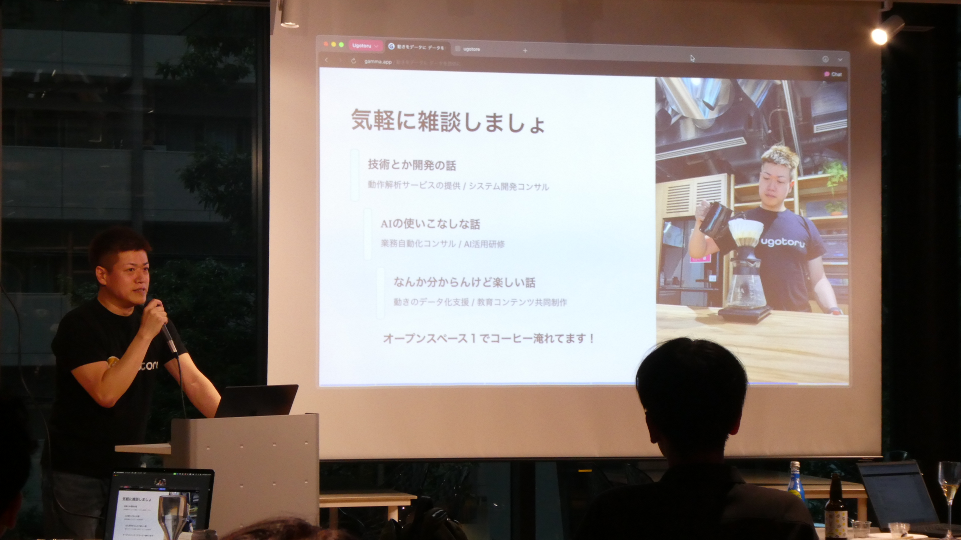 最後に、プレゼン会に参加されていた会員の方に向けて、「ウゴトルTシャツの人」で覚えてね、とフレンドリーにアピール。いつもキッチンでコーヒーを淹れているので、気軽に雑談しましょう!と締めくくってくださいました。