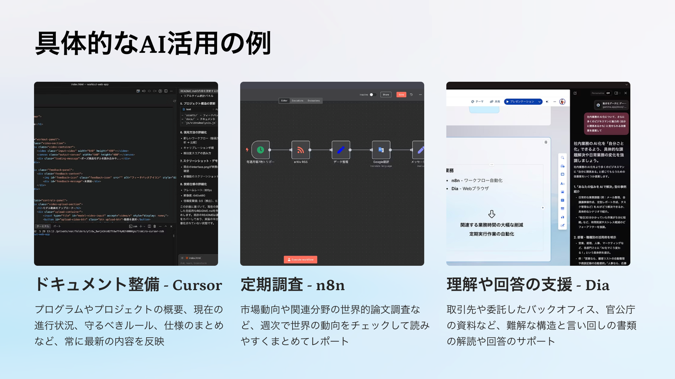 例えば、業務の概要をまとめてくれるドキュメント整理系のシステム。やり方によっては、フォルダ構成をどうしたいか指示すればきれいにファイルを整理してくれるなど、自分では面倒くさがってしまう部分を補完する意味でもAIは便利に活用できるのだそうです。